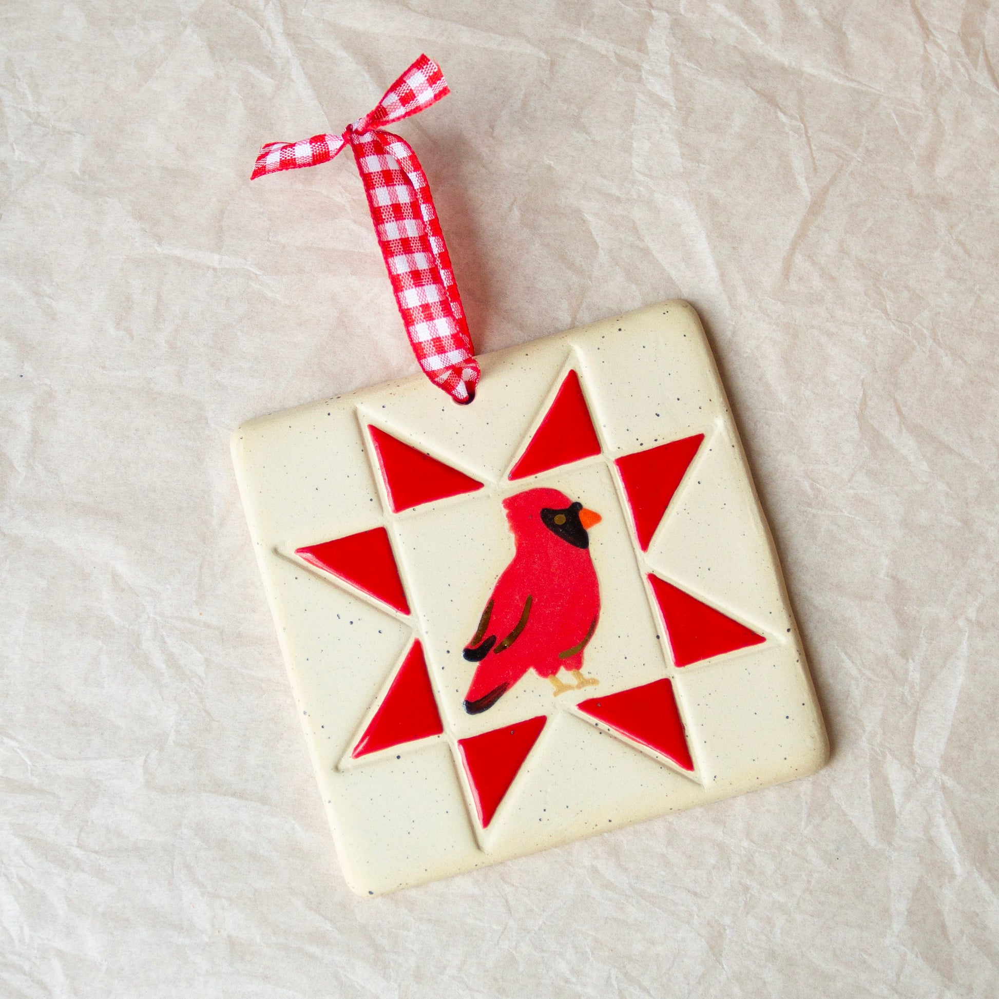 Handmade ceramic wall hanging with gingham ribbon