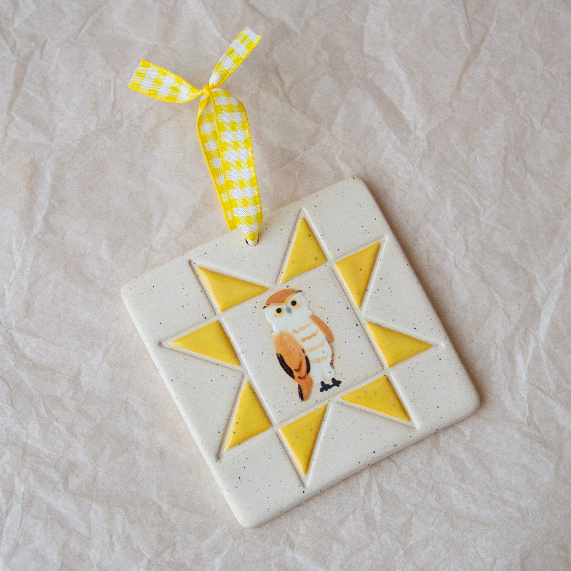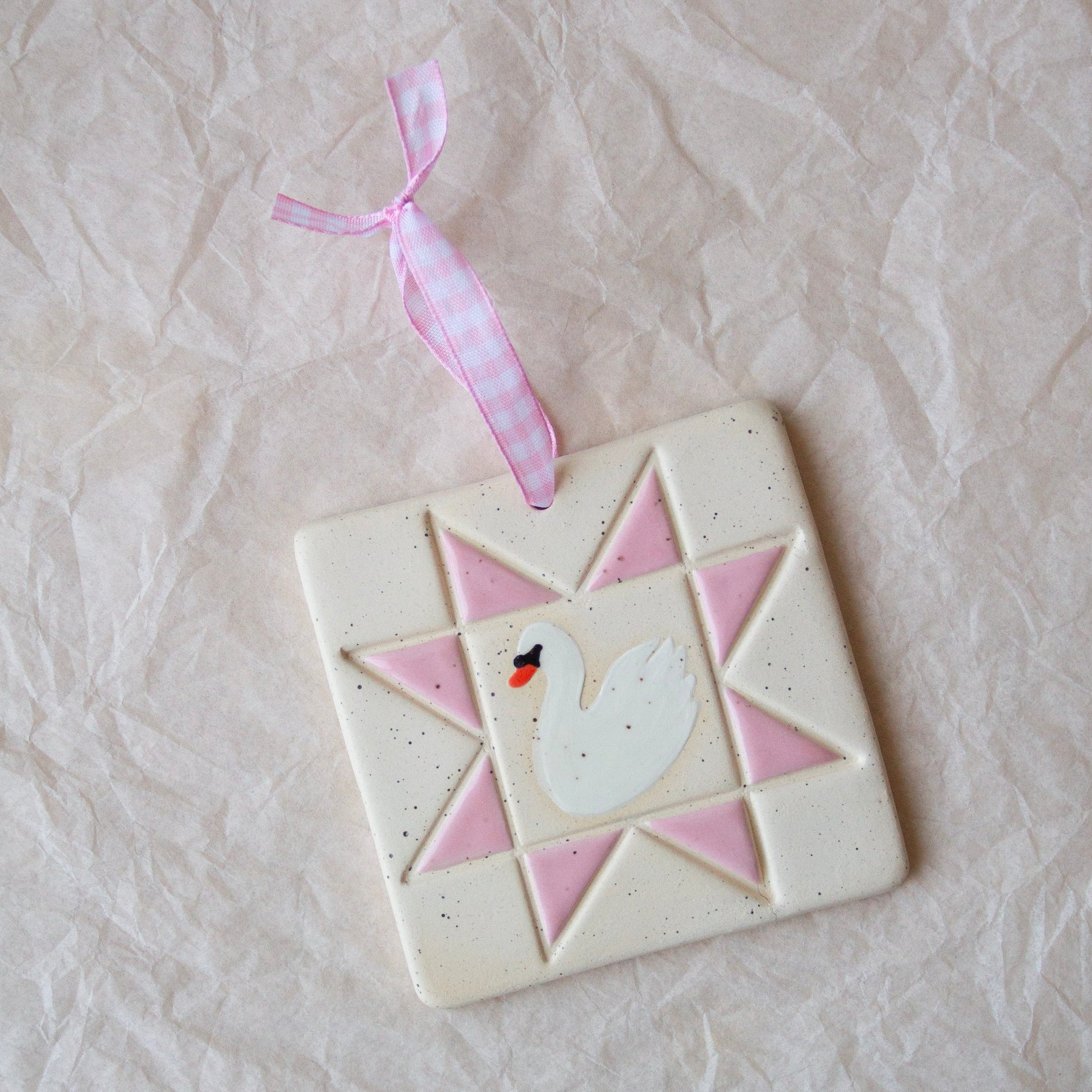 Ceramic bird quilt square wall hanging ***please note the swan has a small cosmetic crack, and it has been discounted because of this! Photo included.