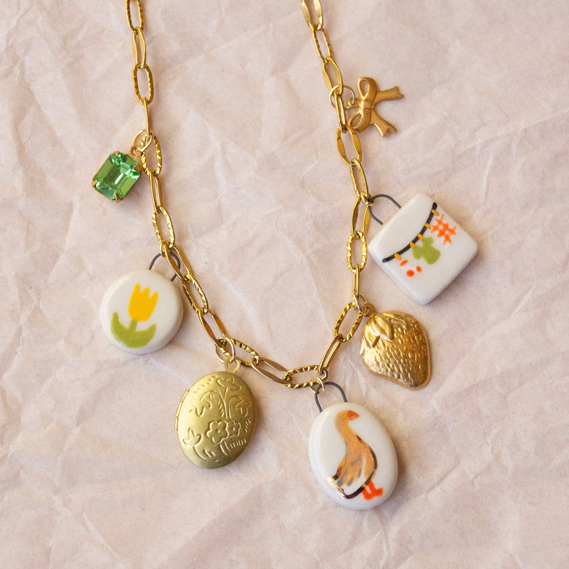 This handmade charm necklace includes handmade ceramic charms and vintage brass charms.